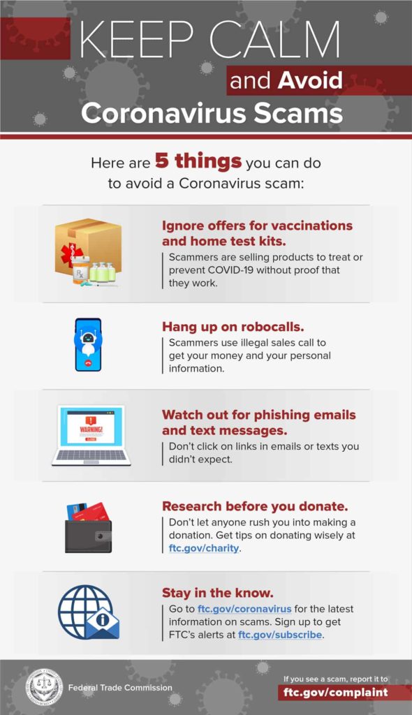 4. DON’T GIVE OUT PERSONAL INFORMATION TO ANYONE UNTIL YOU VERIFY WHO THEY ARE AND IF THEY ARE LEGITIMATE. Scammers are claiming they can provide medical discounts, free and reduced rates on personal protective equipment (PPE), even early federal stimulus checks.