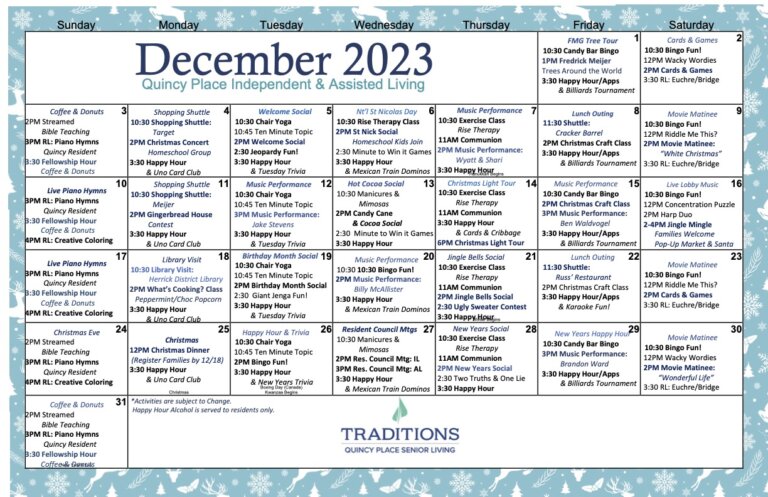 Quincy Place Senior Living is located in Holland, Michigan. We offer Independent Living, Assisted Living, and Memory Care in our senior retirement community. Nursing care and support, along with gracious amenities and lifestyle options are provided to our residents. We are an active adult community, within the Traditions Management family, that can help seniors with aging, Alzheimer’s, and Dementia care.
