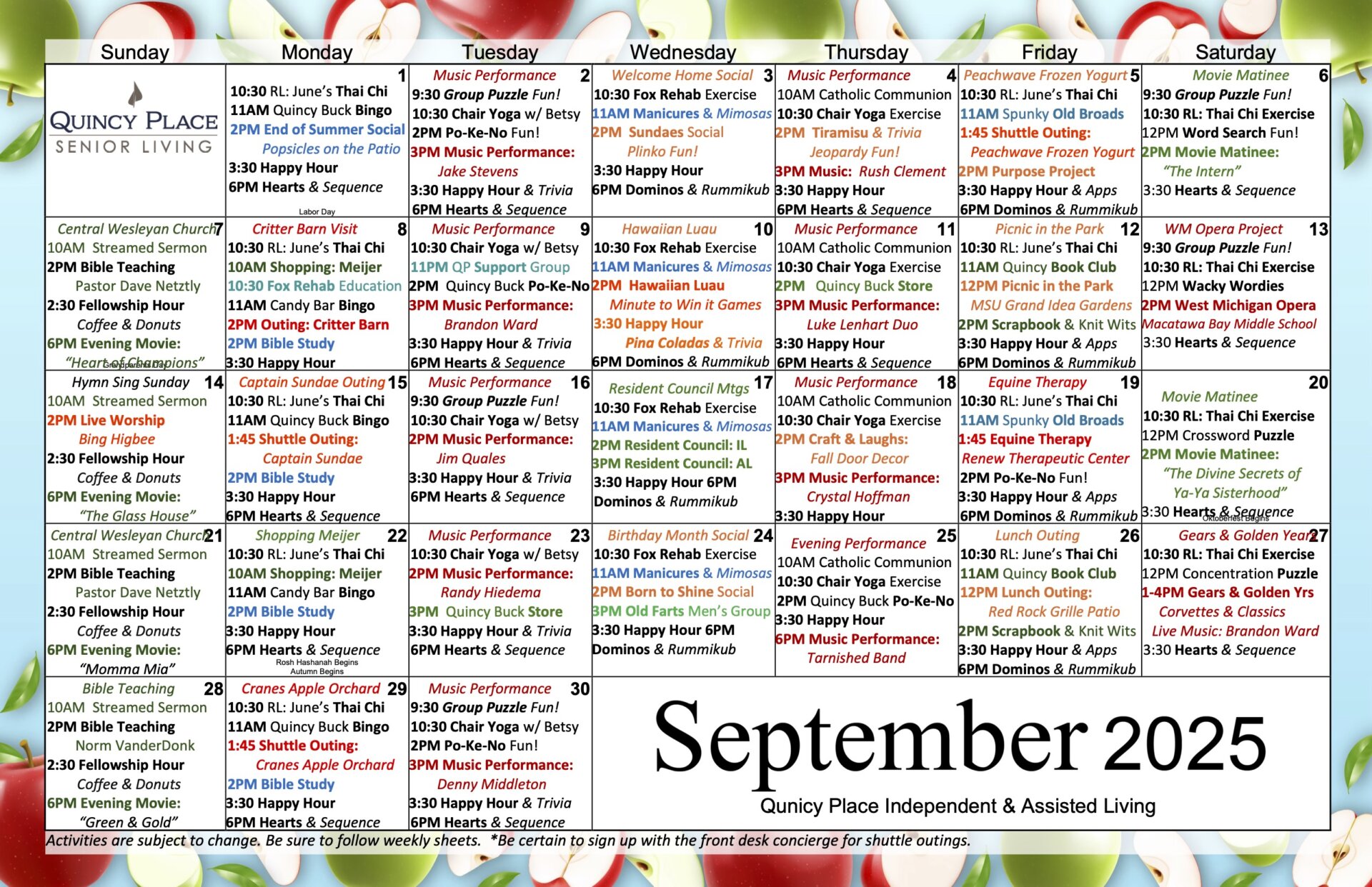 Quincy Place Senior Living September 2025 Activity Calendar